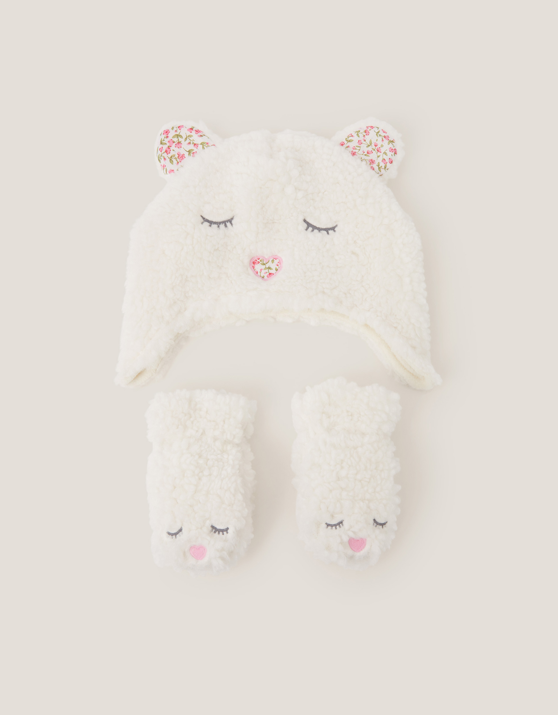 Too adorable for words. Crafted in super-soft borg with floral accents, this set adds a playful touch to their winter looks. Stitched with sleepy teddy eyes and a heart-shaped nose for extra cuteness. Ivory