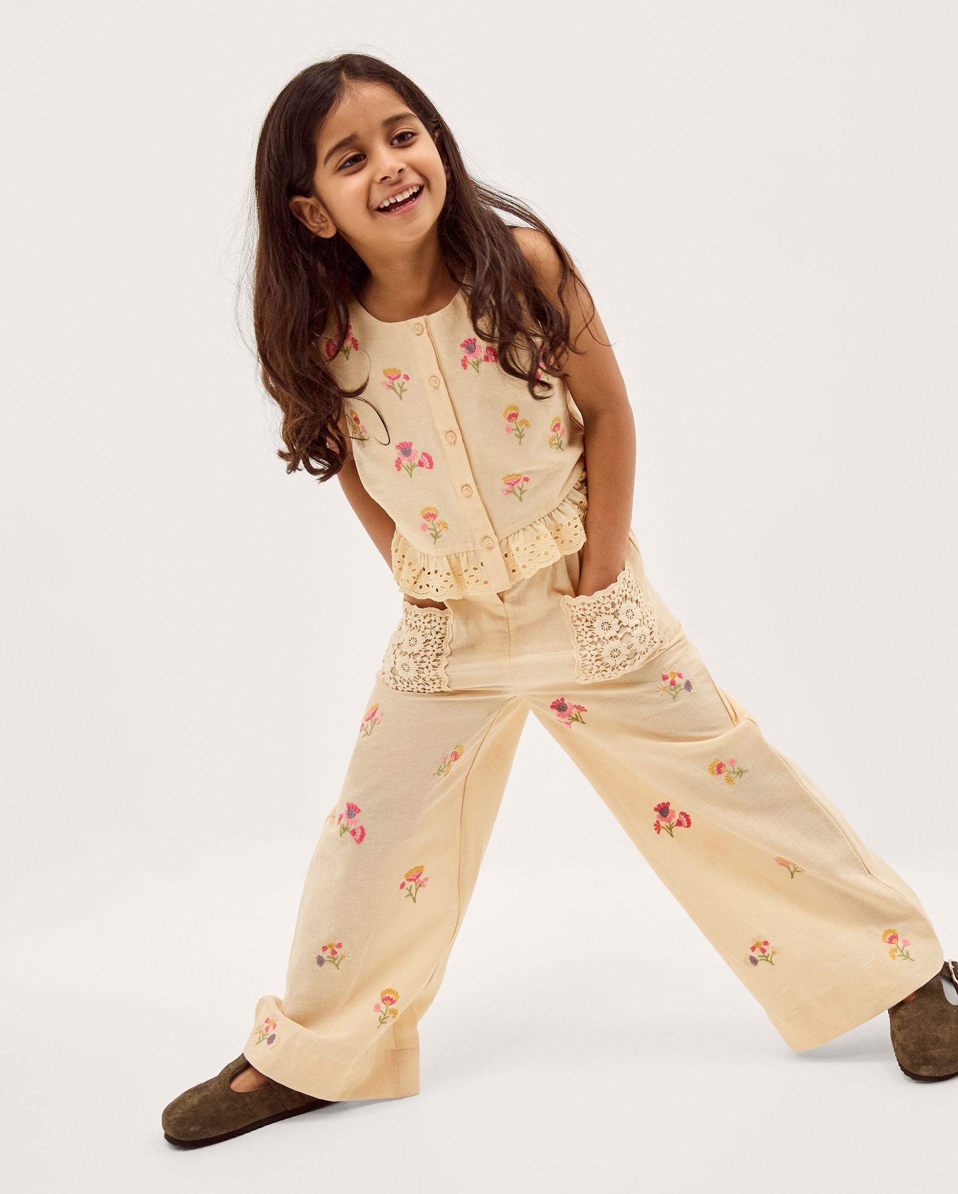 Peachy keen. Spun in a cotton and linen blend and decorated with embroidered flowers, crochet pockets and broderie frills, it’s a playful summer co-ord they can wear day and night. The set includes a button-front sleeveless top and wide leg trousers to match. Sold as a set. Cream