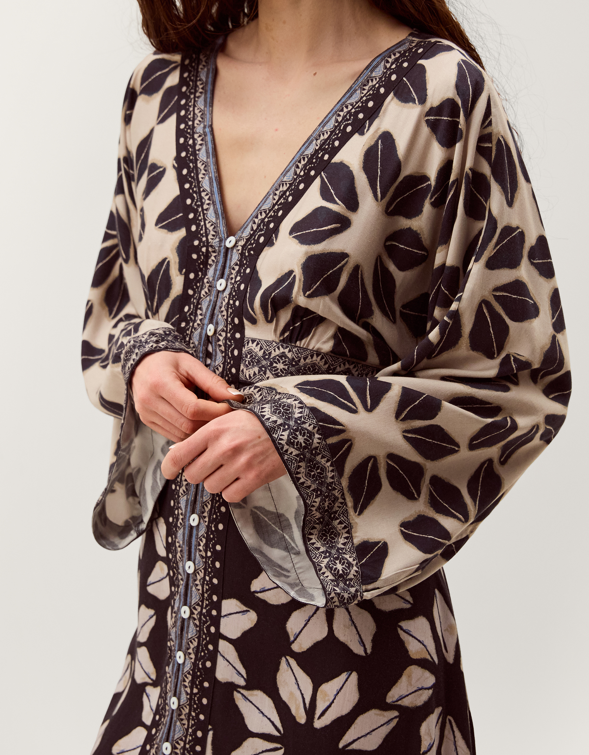 Printed perfection. Crafted for summers at home and away, this midi dress showcases an artful floral print in contrast hues. Spun in a lightweight blend, it’s designed with an ever-flattering v-neckline, relaxed sleeves and decorative panels throughout, creating a piece where details work overtime. Just add flats and chocolate suede accessories. Blue