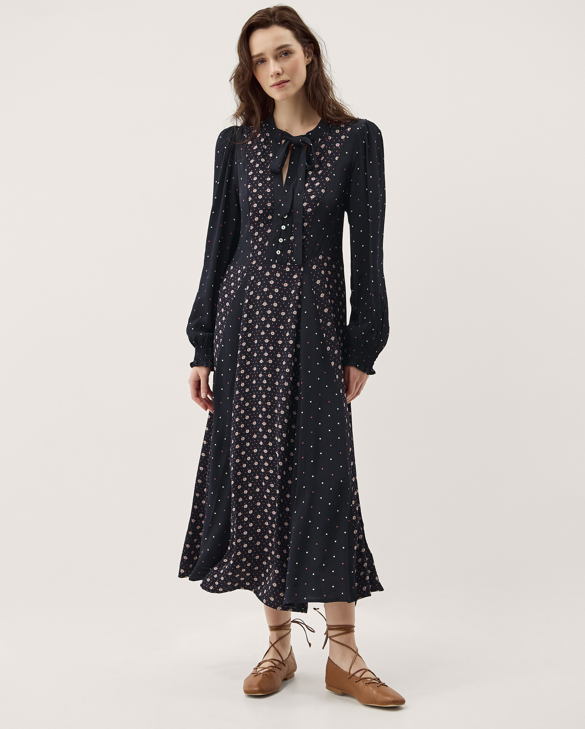 Instant shot of sophistication. Taking you from in-office day to after work drinks, this midi dress is printed with panels of polka dots and dainty flowers. Designed with a long neck tie, smocked sleeves and an ankle-length hem, it’s an understated yet elevated piece to add to your weekly rotation. Blue